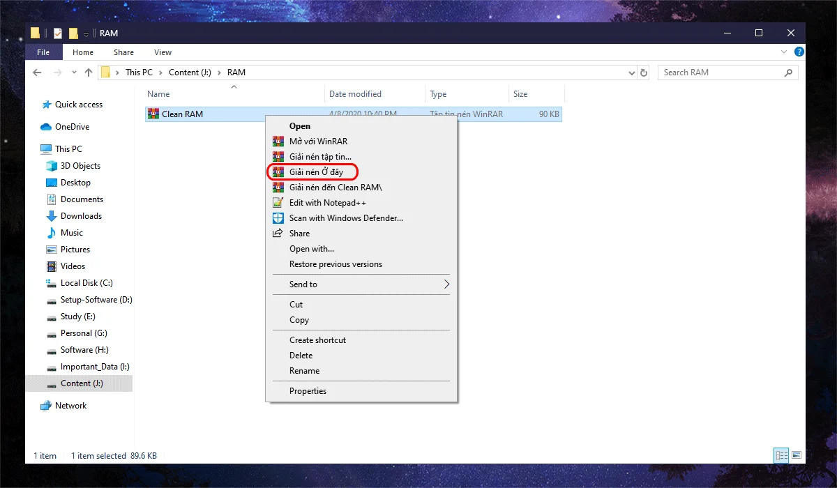 .ziphoặc.rar). Bạn cần chuột phải vào file đó, chọn Extract Here (hoặc Giải nén ở đây) để lấy thư mụcRam Clean 2.0. -