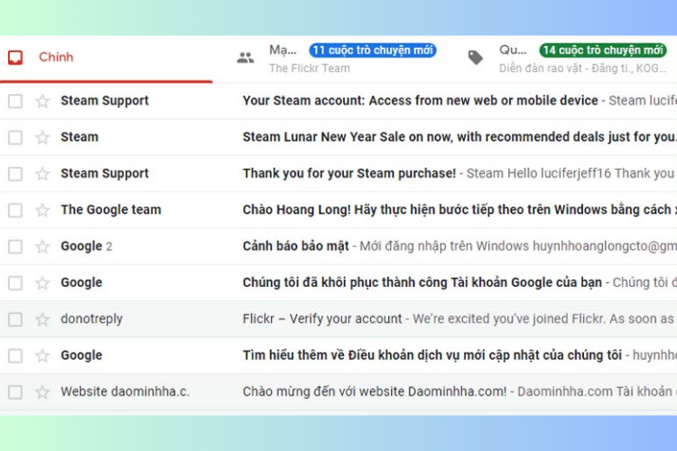 - Chính: Bao gồm các hộp thư quan trọng như thông báo công việc, xác minh OTP, thông báo chỉnh sửa thông tin cá nhân…