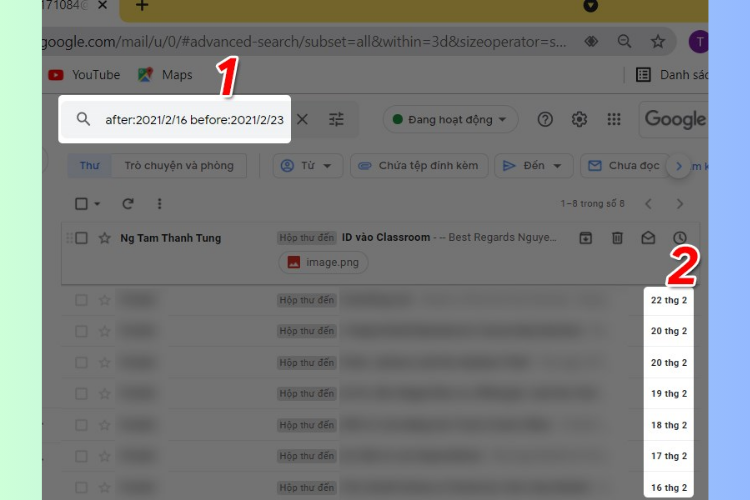 - Bước 7: Lúc này, trên thanh tìm kiếm của Gmail sẽ hiển thị công thức là after:2021/2/16 before:2021/2/23 (Tức là thư gửi sau ngày 16/2/2021 và trước ngày 23/2/2021)