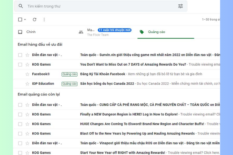 Như đã chia sẻ ở mục 1, Gmail chia ra 3 danh mục chính để giúp bạn phân loại tài liệu một cách dễ dàng hơn. Nếu muốn giải phóng bộ nhớ, hãy bắt đầu xóa thư trong danh mục “Quảng cáo” đầu tiên.