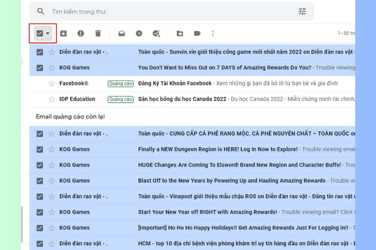 Bước 2: Nhấn vào ô đánh dấu (nằm giữa thanh tìm kiếm và lựa chọn danh mục). Lúc này màn hình hiển thị bạn đã click chọn toàn bộ thư trong trang đầu tiên.