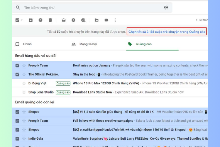 - Bước 3: Thêm các email không được hiển thị trên trang bằng cách bấm vào dòng “Chọn tất cả cuộc trò chuyện trong Quảng cáo”. Lúc này toàn bộ thư và tài liệu trong danh mục này sẽ được click chọn.