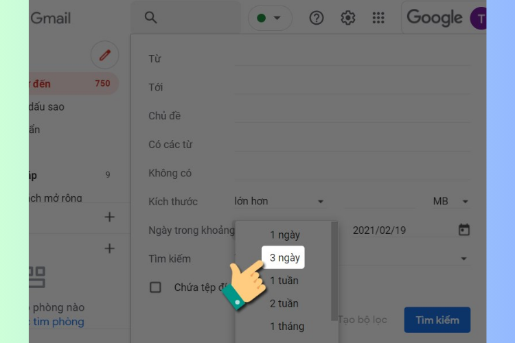 - Bước 5: Tại mục “Ngày trong khoảng”, hãy nhấn chọn mốc thời gian mà bạn muốn lọc. Ví dụ như 1 ngày, 3 tuần, 2 tháng…