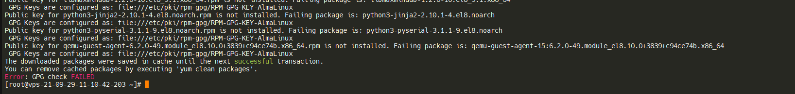 Nếu khi chạy lệnh trên Almalinux bạn thường gặp lỗi như ảnh phía dưới Error: GPG check FAILED. VPSRE sẽ hướng dẫn bạn cách xử lý lỗi này khi gặp phải.