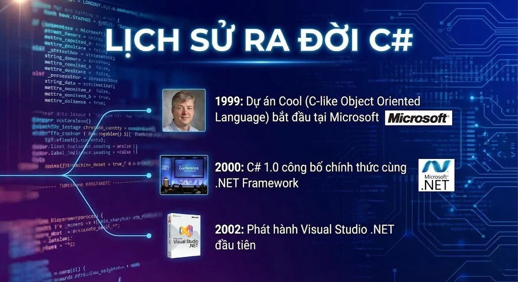 C# được phát minh bởi Anders Hejlsberg – cha đẻ của Turbo Pascal và Delphi – tại Microsoft vào năm 2000. Ngôn ngữ này là sự kết hợp hài hòa giữa tính đơn giản, an toàn của Java và sức mạnh, hiệu năng của C++. Không chỉ kế thừa những ưu điểm từ các ngôn ngữ tiền nhiệm, C# còn liên tục được cải tiến và mở rộng qua nhiều phiên bản, mang đến các tính năng hiện đại như LINQ, async/await và hỗ trợ lập trình bất đồng bộ hiệu quả.