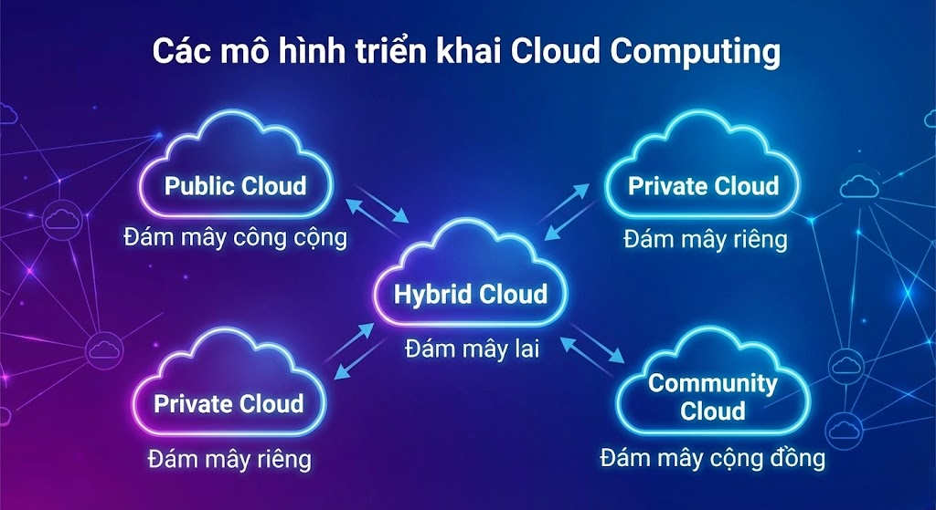 Cloud Computing có nhiều mô hình triển khai, tuy nhiên thường có ba mô hình triển khai chính, mỗi mô hình có các đặc điểm, lợi ích và hạn chế riêng, phù hợp với các nhu cầu khác nhau của doanh nghiệp và tổ chức.