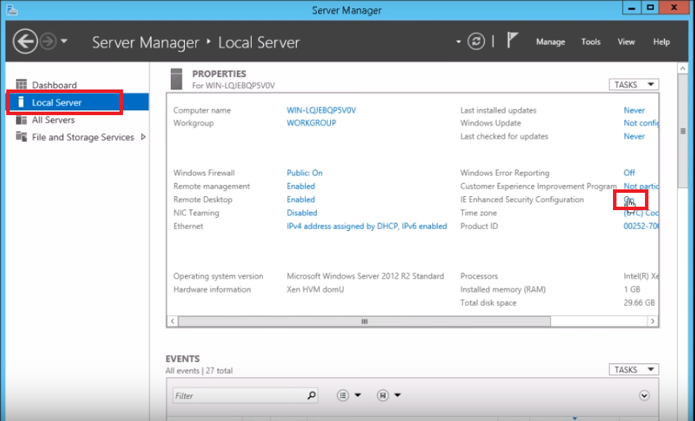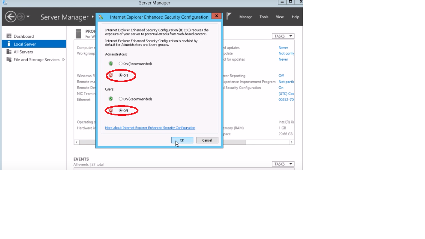 Bước 2: Truy cập Local Server – bật On chế độ IE Enhanced security cofiguration