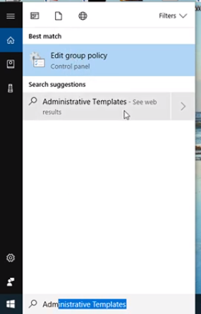 Các bạn sẽ vào phần seach của win 10 với từ khóa: Adminstrative Templates và lựa chọn vào phần Edit group policy.