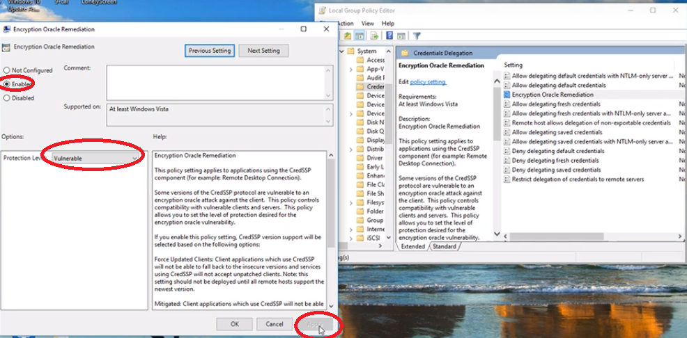 Bước 2: Tại Register các bạn truy cập theo đường dẫn: Adminstrative Templates> system> CredentialDelegation> Encryption Oracle Remediation (mình sẽ không chụp ảnh lại đoạn này các bạn cứ theo đường dẫn để làm nhé)
