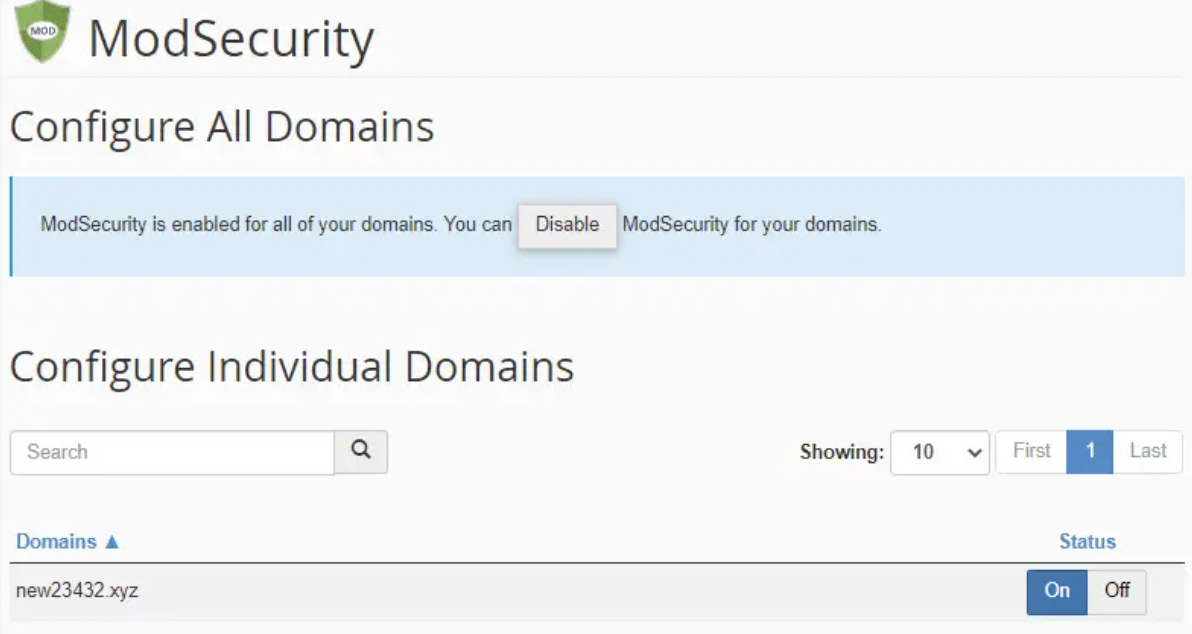 Bước 2: Chọn tên miền đang bị lỗi và chuyển trạng thái ModSecurity từ On (Bật) sang Off (Tắt).