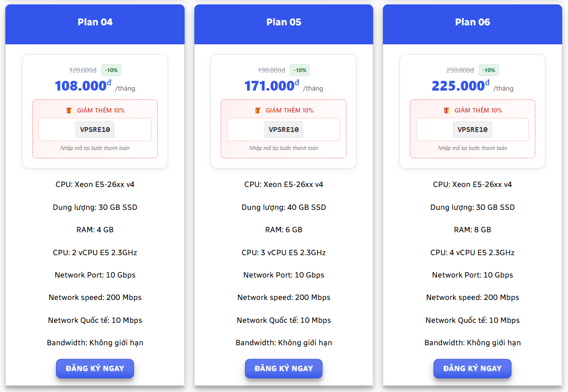 - Cấu hình gợi ý: 4GB RAM, 2 vCPU, 40GB NVMe SSD, giá từ 120.000 VND/tháng.