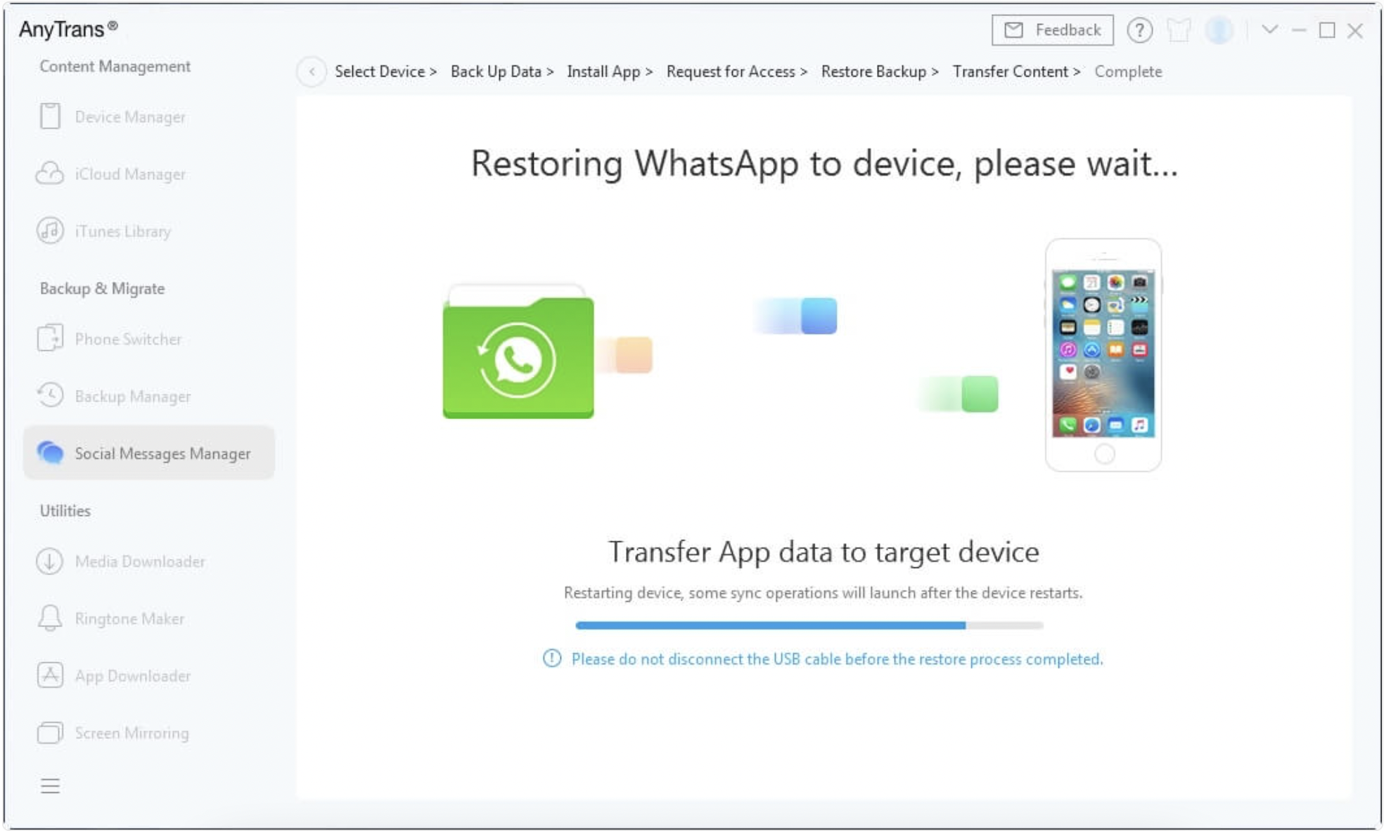 Bước 6: AnyTrans sẽ bắt đầu chuyển dữ liệu WhatsApp sang iPhone của bạn.