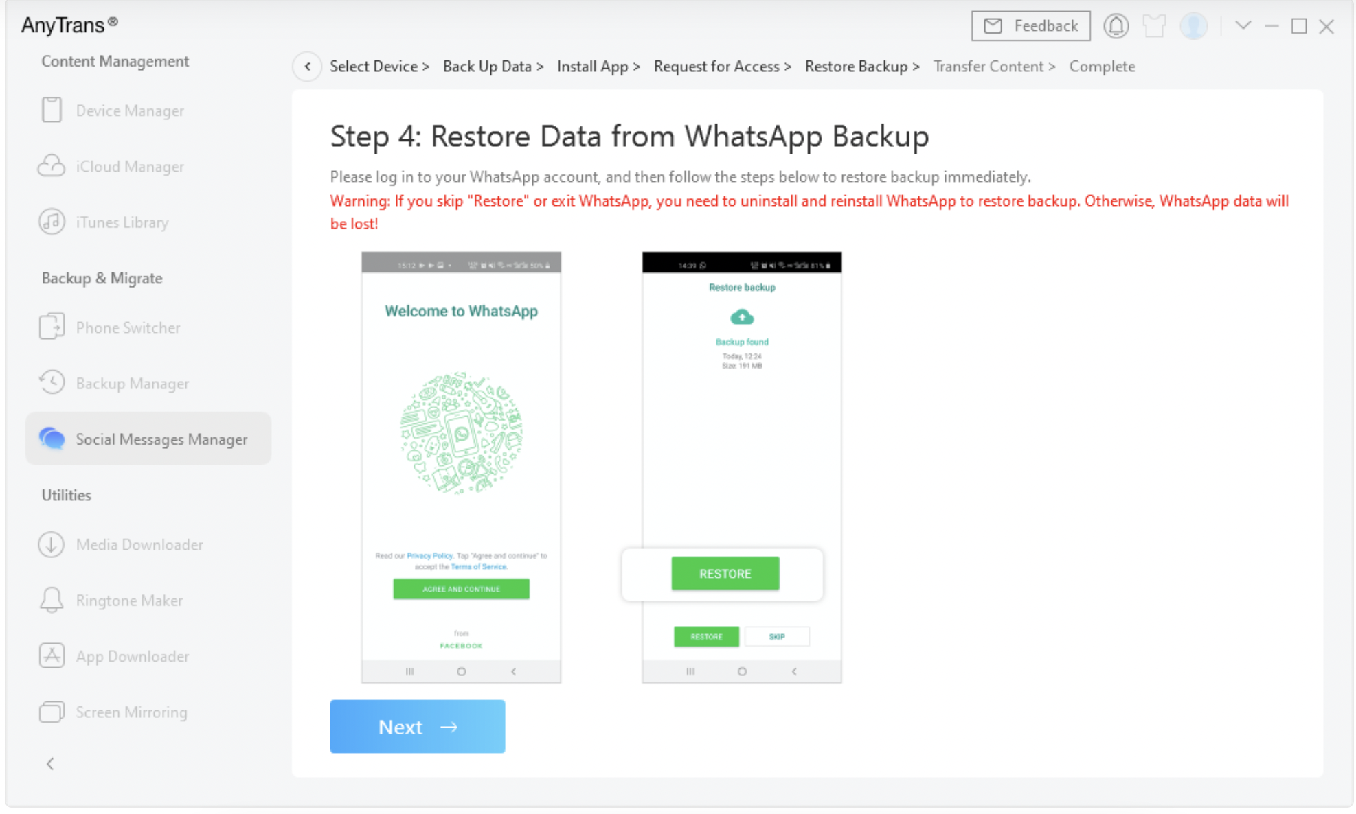 Bước 5: Đăng nhập vào WhatsApp trên Android của bạn và nhấn vào nút Khôi phục (thao tác này sẽ khôi phục bản sao lưu bạn vừa tạo sang phiên bản WhatsApp nâng cao hiện tại) > Sau đó nhấp vào Tiếp theo trong AnyTrans.