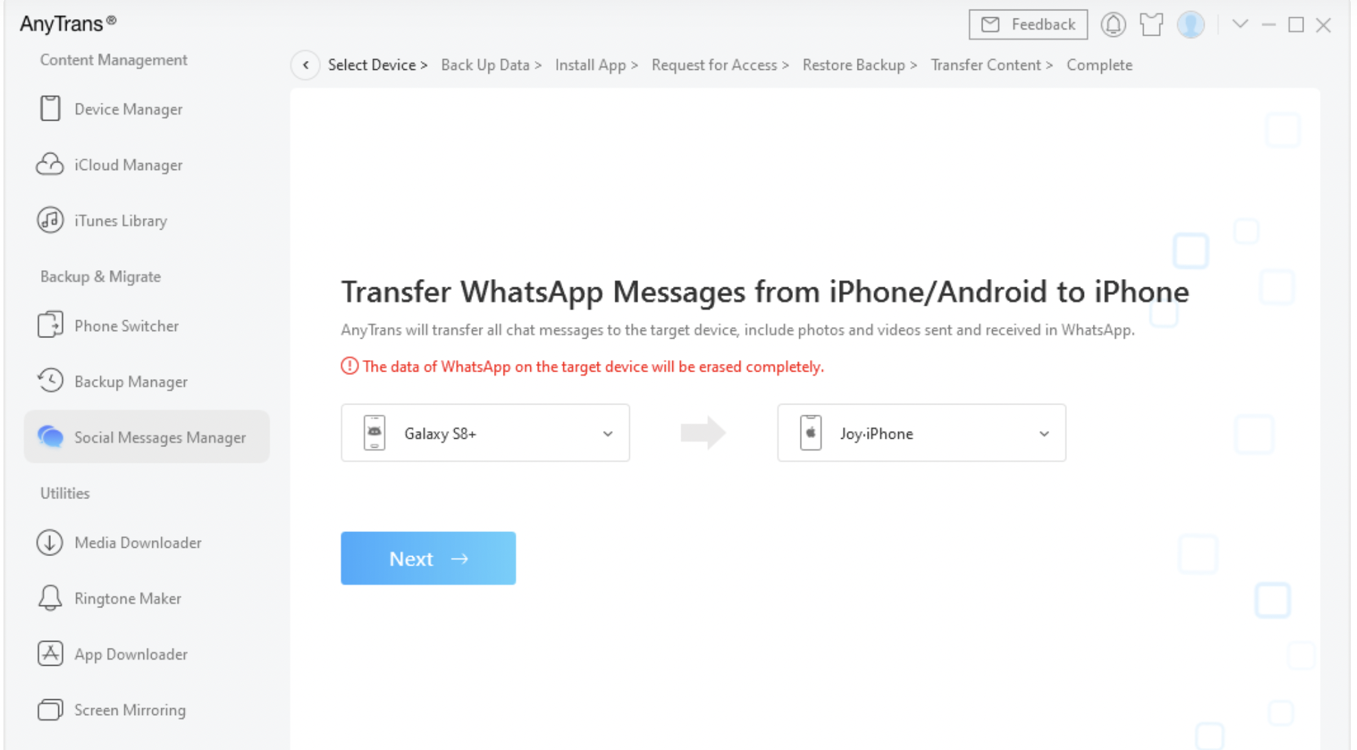 Chọn Android của bạn làm điện thoại nguồn và iPhone mới của bạn làm điện thoại mục tiêu > Nhấp vào nút “Tiếp theo” để chuyển tin nhắn WhatsApp sang iPhone mới của bạn.