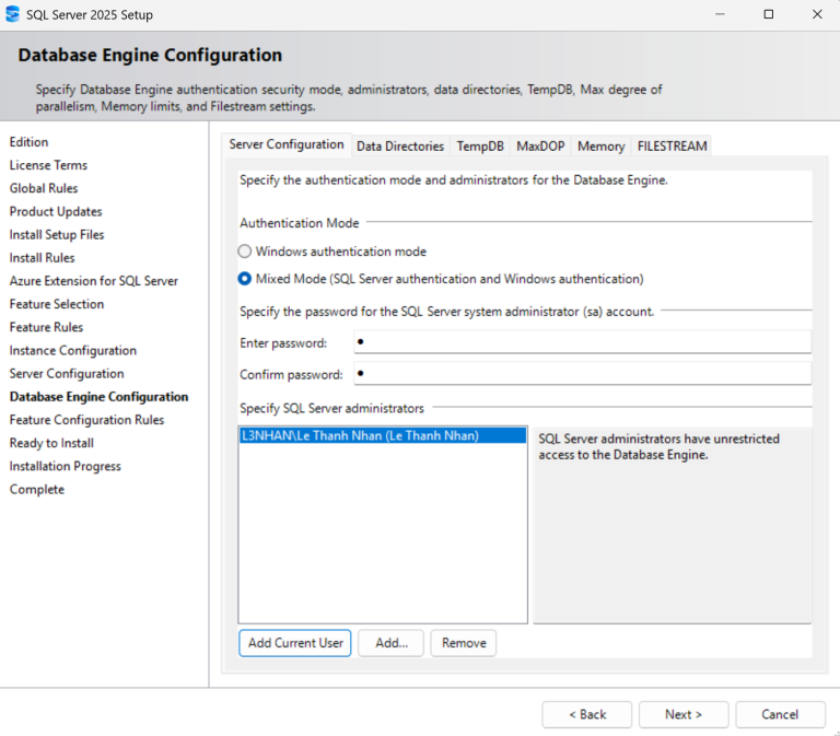 - Khi cài đặt bỏ qua mode này, việc lập trình cần dùng tài khoản SQL Server sẽ gặp khó khăn trong các môn tiếp theo.