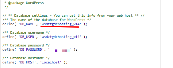 Bạn truy cập file để kiểm tra, ở đây phần DB_NAME sẽ tương ứng với tên database của website.