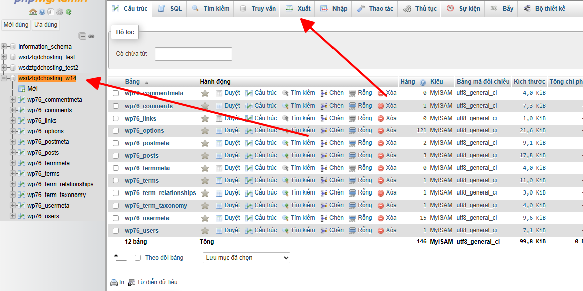 Bạn chọn đúng Database của website và ấn Xuất.
