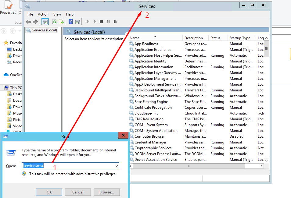 2. Trong menu Run, điền “services.msc” và ấn Enter để thực thi, hộp thoại Services hiện ra.