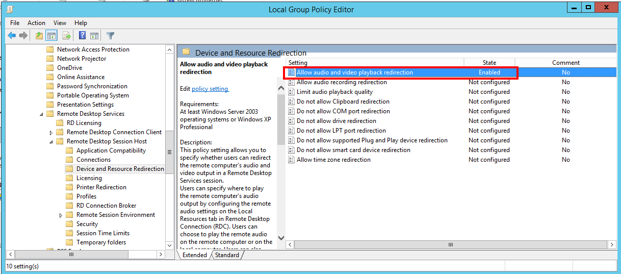 2. Trên Local Group Policy Editor >> Computer Configuration >> Administrative Templates >> Windows Components >> Remote Desktop Services >> Remote Desktop Session Host >> Device and Resource Redirection. Click chuột trái 2 lần để mở tuỳ chọn Allow audio and video playback redirection và chọn Enable >> Apply >> OK.
