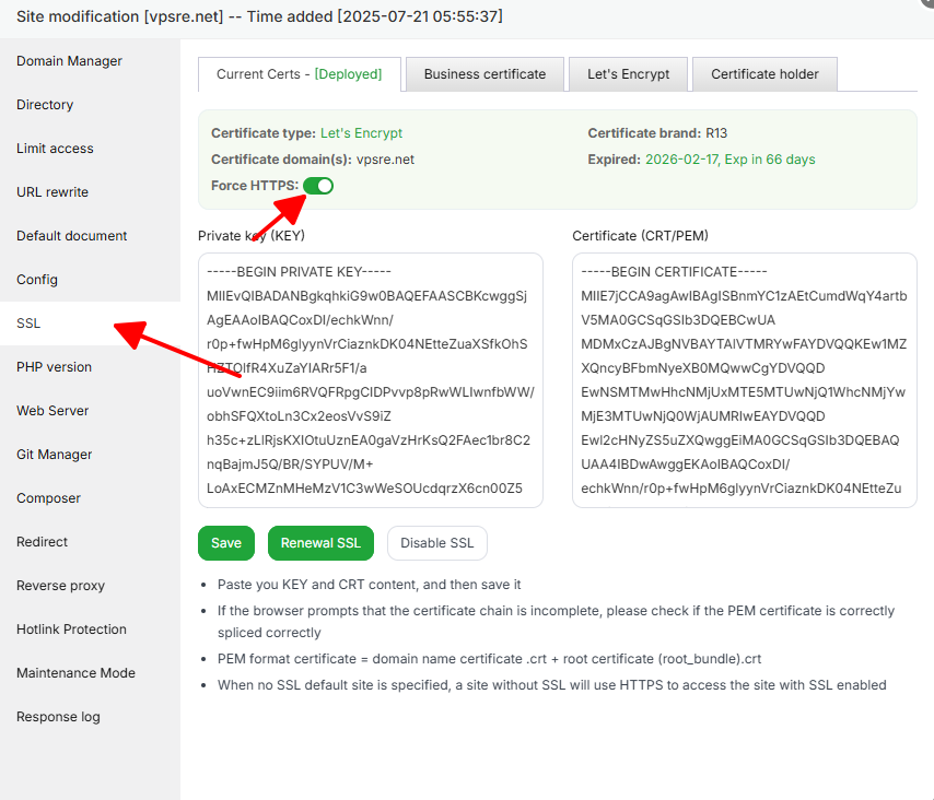 Bước 4: Bạn tick chọn Force HTTPS để website tự động chuyển sang giao thức HTTPS.