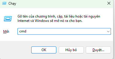 Để xác nhận NVM đã được cài đặt thành công, bạn hãy mở Command Prompt hoặc PowerShell bằng cách nhấn tổ hợp phím Windows + R, nhập cmd và nhấn Enter.