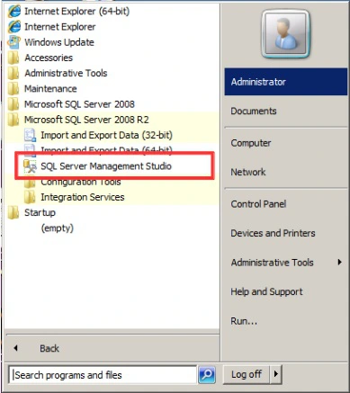 Để kiểm tra hoạt động SQL, bạn truy cập vào SSMS theo thứ tự sau: Start >> Microsoft SQL Server 2008 R2 >> SQL Server Management Studio: