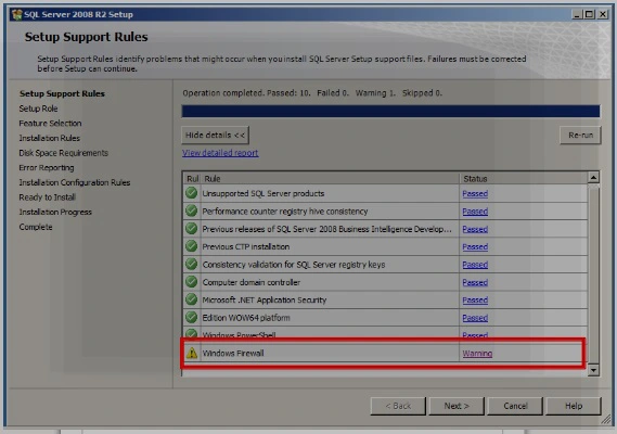 Khi chuyển tới bước Setup Support Rules đầu tiên, phần mềm SQL sẽ tự động kiểm tra danh sách các yêu cầu cần thỏa mãn để cài đặt và cách hoạt động của SQL Server. Nếu có vấn đề gì, phần mềm sẽ tự sửa lỗi và tiếp tục cài đặt, có thể bỏ qua các warning.