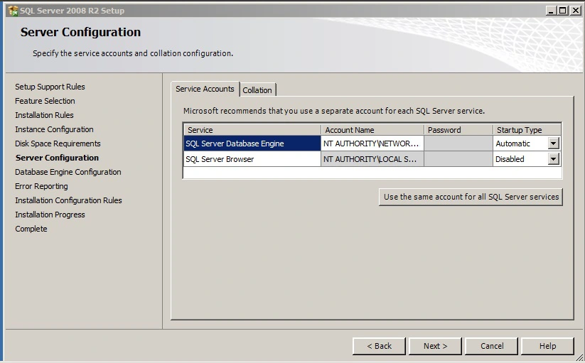 Tại mục Server Configuration, chúng ta có thể cấu hình các người dùng có quyền sử dụng dịch vụ và chọn Next.