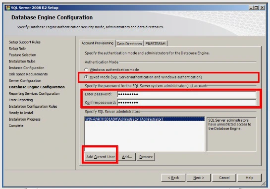 Tại Database Engine Configuration, chúng ta có thể thiết lập các quyền quản trị và chế độ xác thực. Ở bước này, bạn nên chọn Mixed mode (hỗ trợ mode SQL Server Authentication và mode Windows Authentication), sau đó nhập mật khẩu và click Add Current User để chọn User hiện tại làm tài khoản quản trị.