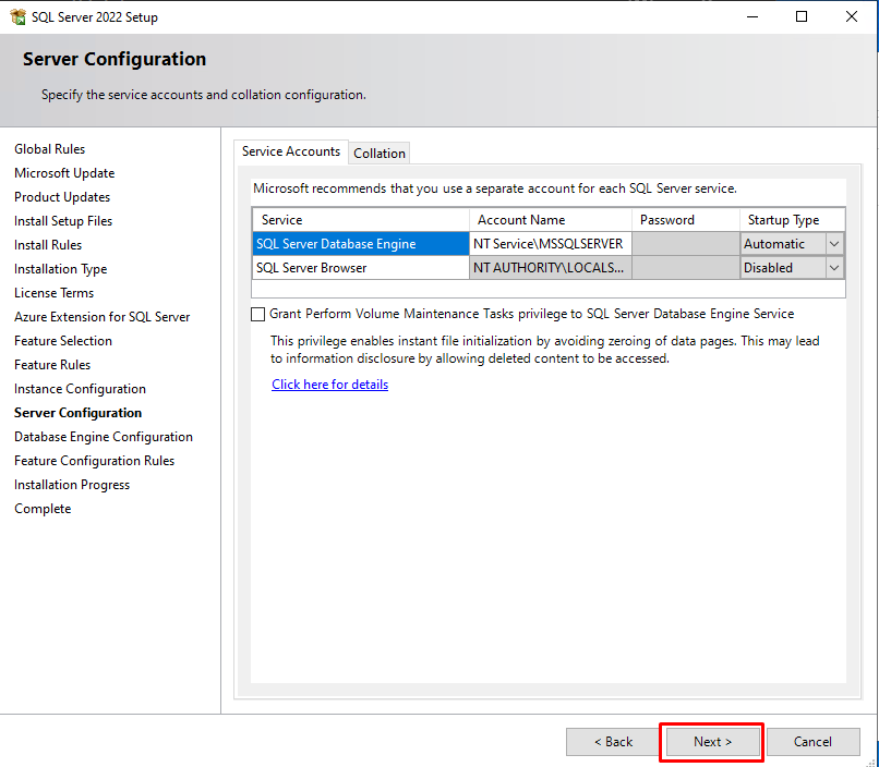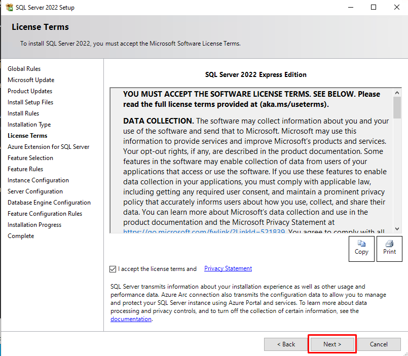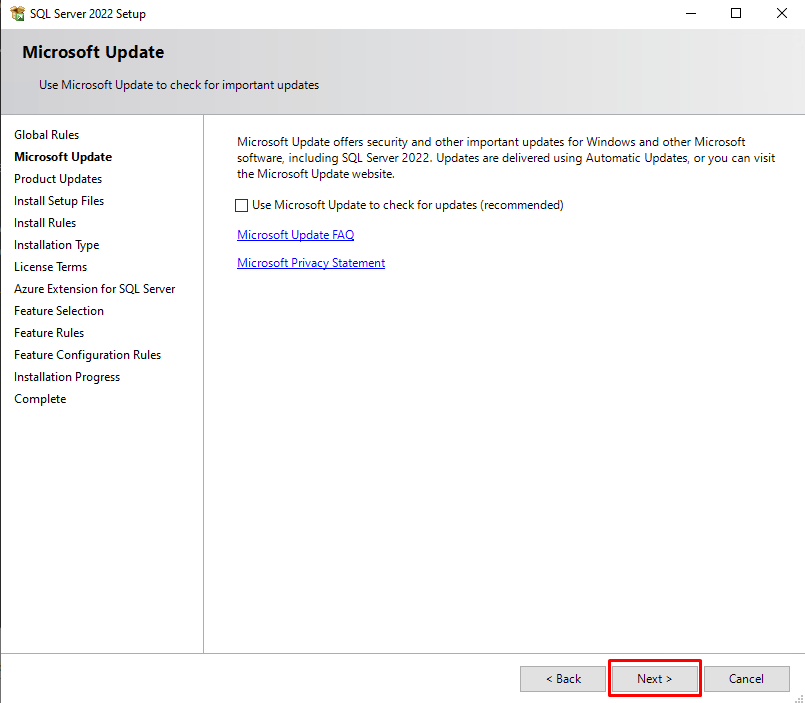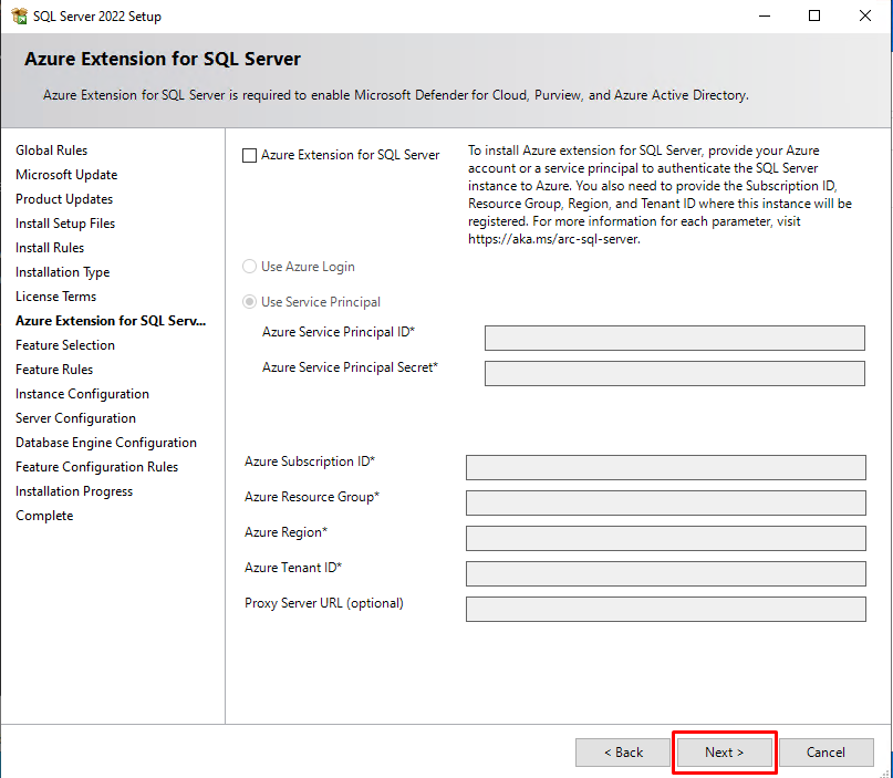 Bỏ chọn Azure Extension for SQL Server –> Next: