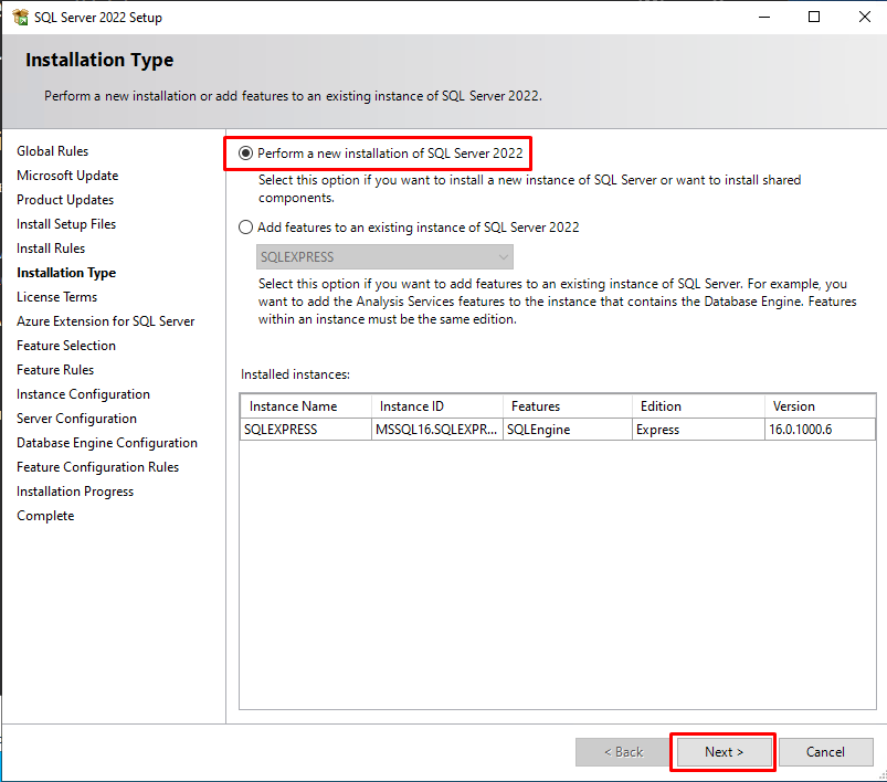 – Chọn Perform a new installation of SQL Server 2022 –> Next: