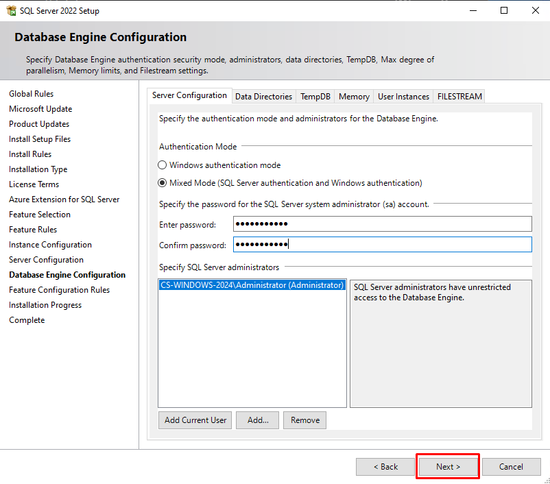 – Trong phần Authentication Mode chọn Mixed Mode (SQL Server authentication and Windows authentication) –> Điền thông tin password của tài khoản sa –> Next