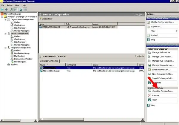 • Chọn Server Configuration trong menu bên trái, sau đó chọn chứng thư số đang pending trong mục Exchange certificates trong menu giữa. Bạn có thể nhận ra chứng thư số này dựa vào Friendly Name mà bạn đã nhập trong quá trình tạo CSR. Giá trị trong cột Self Signed sẽ là True. Sau đó chọn mục Complete Pending Request trong menu bên phải.