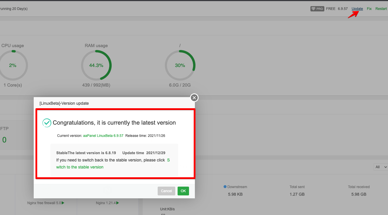 2. Hướng dẫn cập nhật phiên bản aaPanel?