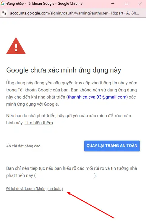 Sau khi bạn điền xong nhấn vào nút Sign in with Google, cửa sổ sẽ hiện ra hãy nhấn nâng cao và đi tới devttt.com.