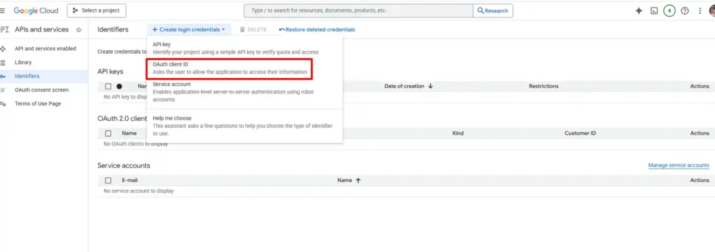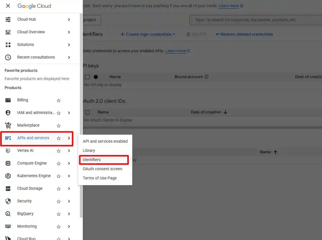 Tạo Credentials bằng cách APIs & Services và chọn Identiftiers.