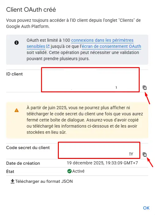 Sau khi Create, Client ID và Client Secret sẽ hiện ra bạn cần sao chép cả hai và lưu ở note ghi nhớ an toàn. Sau đó, nhấn OK để đóng cửa sổ popup.