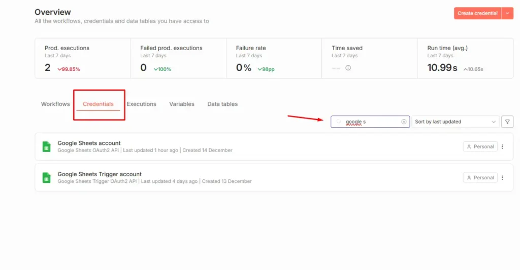 Ở trang giao diện n8n nhấn Credentials, chọn ô tìm kiếm gõ Googsheet