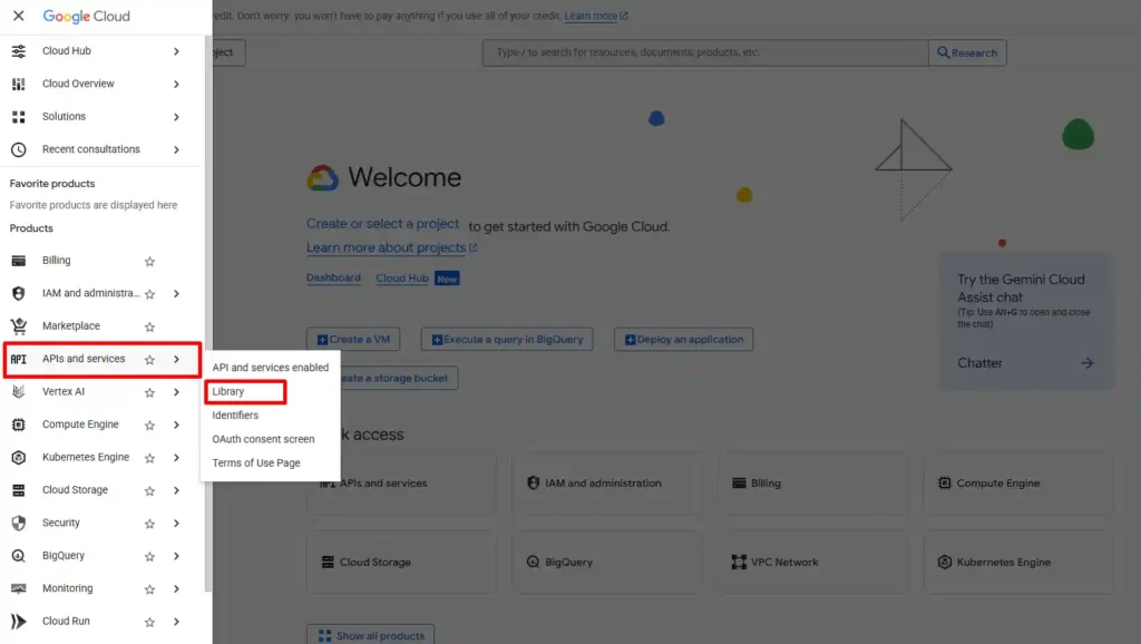 Sau khi project được tạo, bạn cần bật các API mà n8n sẽ sử dụng. Trong menu bên trái chọn APIs & Services → Library
