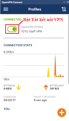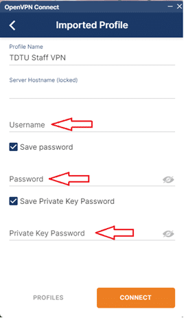 Lưu ý: Người dùng nhấn vào Save password và Save Private Key Password để lưu lại thông tin, khi đăng nhập cho những lần sau chỉ cần mở phần mềm OpenVPN Connect để kết nối VPN.