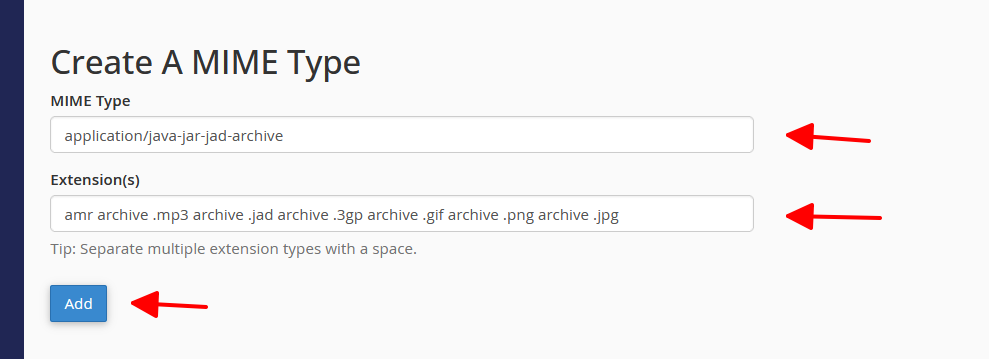 Để thêm một MIME Type các bạn điền vào MIME Type và Extension(s) trong mục Create a MIME Type rồi ấn Add.