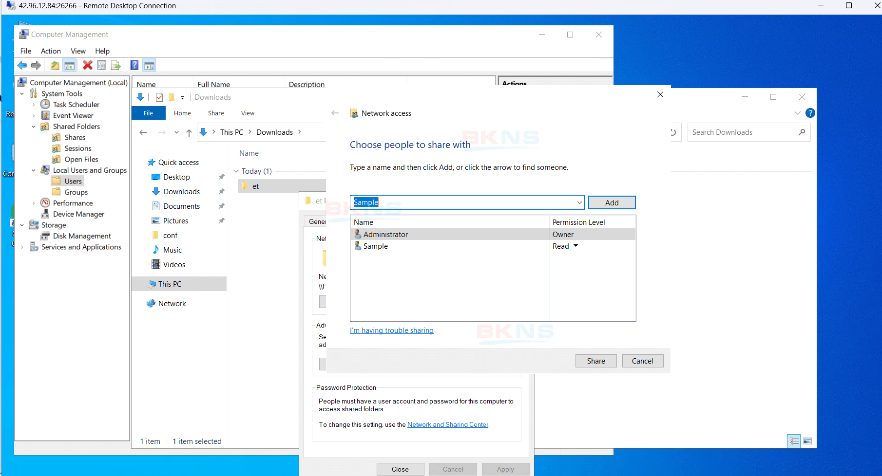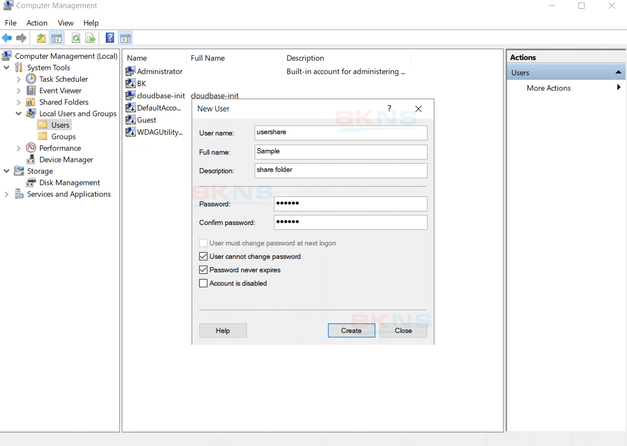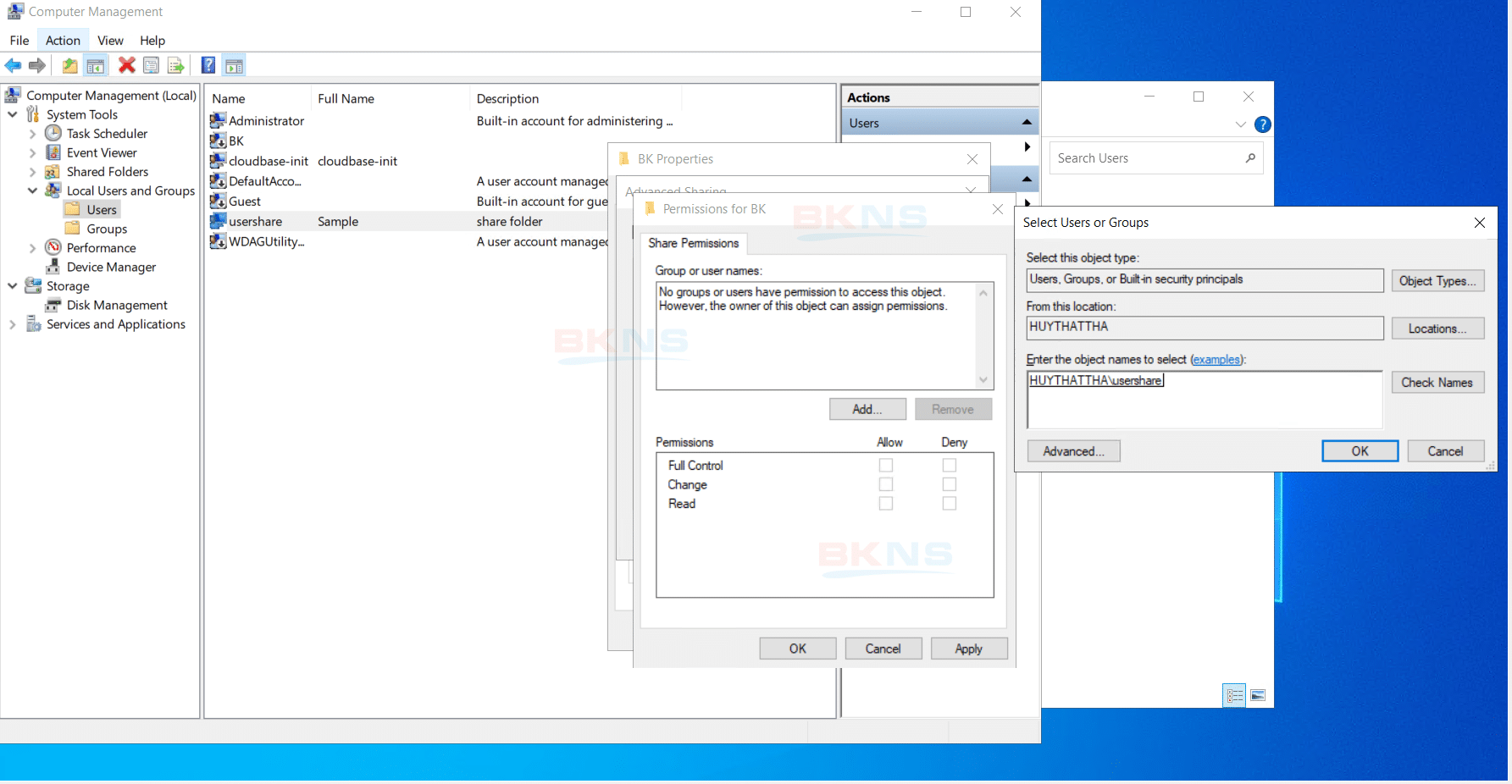 Bước 1 : Gõ thanh tìm kiếm => Computer Management => Local Users and Groups => Users => Add new user ( Đây là user dùng để share thư mục khi truy cập )