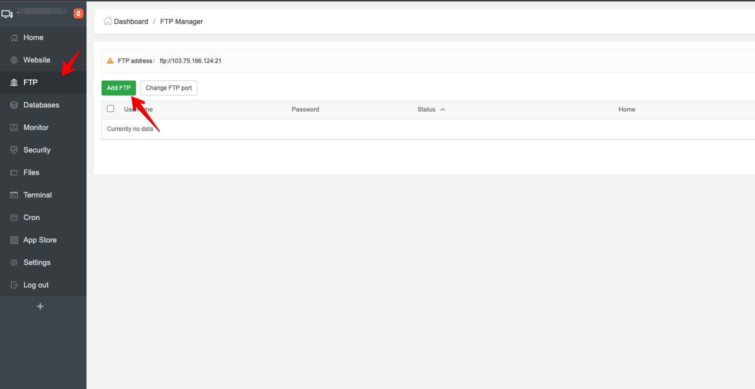 – Sau khi đã đăng nhập thành công vào được aaPanel, bây giờ bạn có thể thao tác với FTP như sau: