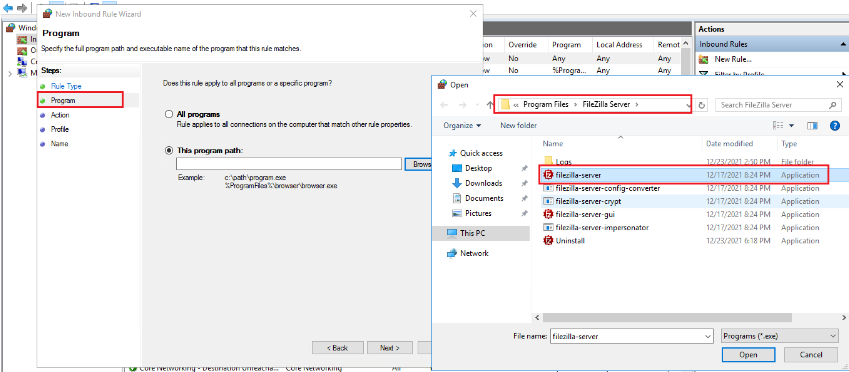 Trên giao diện Windows Firewall with Advanced Security, click chọn Inbound Rules ở cột bên trái rồi chọn New Rule… ở cột bên phải. Cọn Program >> Chọn đúng đường dẫn chưa file cài đặt filezila Server (ổ C >> ProgramFile >> FileZilla Server\filezilla-server.exe).