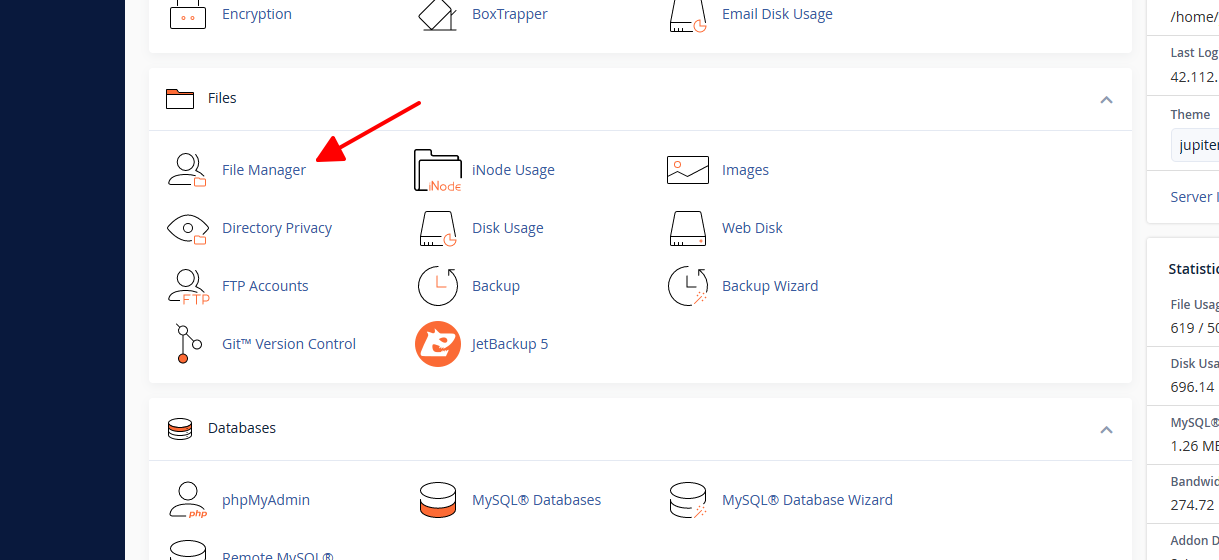 Đăng nhập vào cPanel, tìm đến phần Files và chọn menu File Manager.