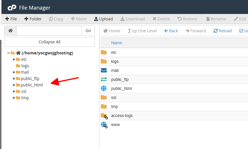 Tại đây, bạn cần xác định vị trí lưu trữ web. Nếu tải dữ liệu cho tên miền chính, hãy mở thư mục public_html.