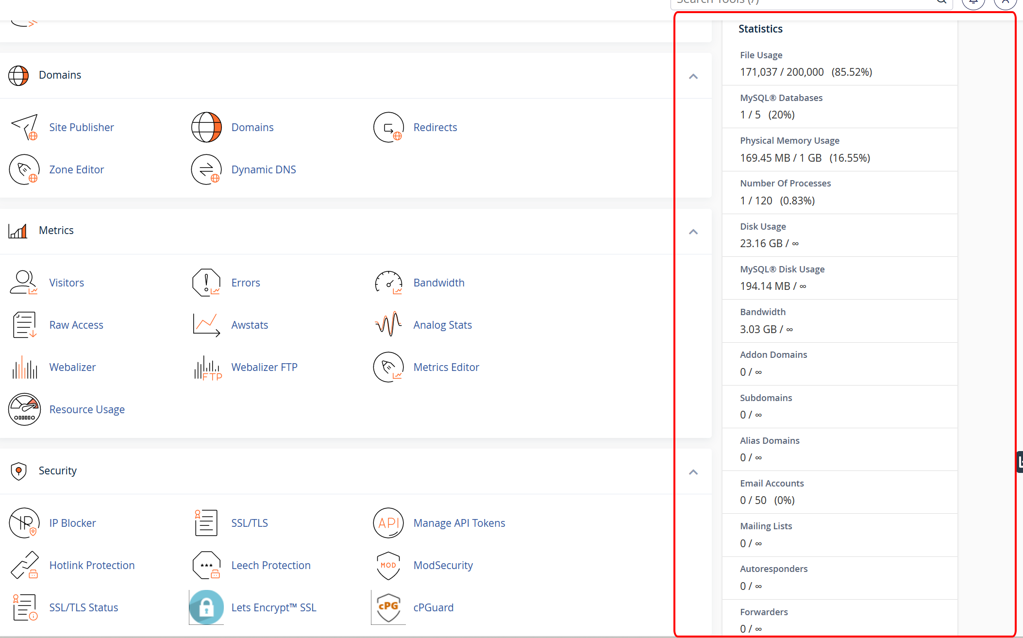 Đầu tiên bạn cần đăng nhập vào Hosting và Kéo xuống góc dưới bên phải, bạn sẽ thấy khu vực Statistics, mọi thông số về kỹ thuật sẽ thể hiện bên trong đó.
