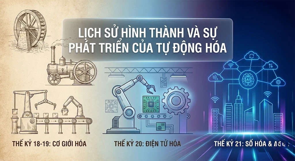 Tự động hóa không phải là một khái niệm mới mẻ, mà là thành quả của quá trình phát triển lâu dài song hành cùng tiến bộ khoa học – kỹ thuật của nhân loại. Những nền tảng ban đầu của tự động hóa hình thành từ thời kỳ cơ giới hóa, khi máy móc bắt đầu được sử dụng để thay thế sức lao động thủ công trong sản xuất.