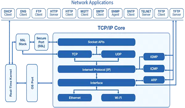 Mô hình TCP/IP có sự kết hợp giữa các giao thức riêng biệt. Nhiệm vụ của mỗi giao thức là giúp máy tính có thể kết nối, truyền thông tin qua lại với nhau. TCP là giao thức điều khiển truyền nhận còn Internet Protoco (IP) là giao thức liên mạng. TCP/IP gồm 4 tầng đó là tầng ứng dụng, tầng mạng, tầng giao vận và tầng vật lý.