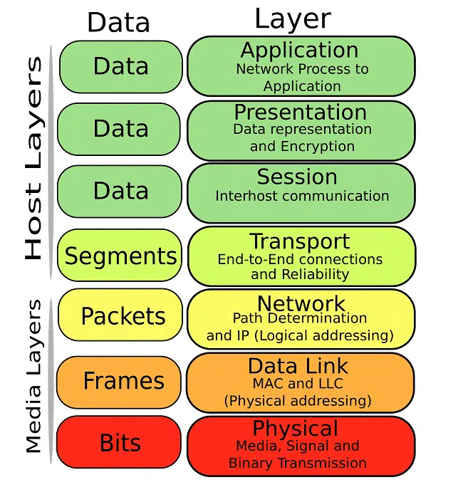 Mô hình OSI chia giao tiếp mạng thành 7 tầng. Từ tầng 1 đến tầng 4 là là những lớp thuộc cấp thấp, nó thực hiện nhiệm vụ di chuyển dữ liệu. Từ tầng 5 đến tầng 7 là lớp thuộc cấp cao, thực hiện nhiệm vụ đặc thù và chuyển tiếp dữ liệu.
